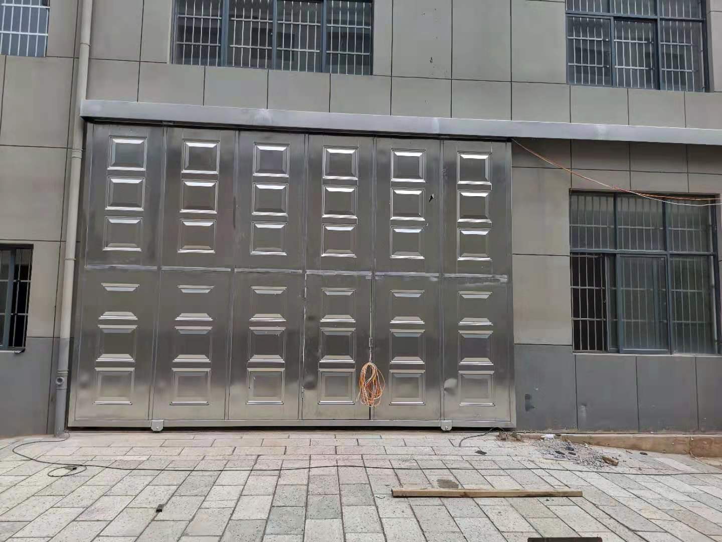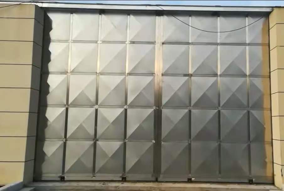 門扇厚度為100 mm,大門所用材料為SUS304不銹鋼。外框采用100×100×3mm方管,內(nèi)骨架尺寸800×800mm,采用,100×50×2mm方管,雙面封1.5mm厚不銹鋼磨沙板,中間聚氨酯發(fā)泡,外框內(nèi)框和封板均采用焊接和柳接工作工藝制作,表面打磨光滑,下軌道采用12kg鋼軌道,上導(dǎo)道采用120#防傾倒槽鋼,導(dǎo)向輪采用¢100軸承。整個(gè)門體采用下承重方式,齒輪齒條傳動(dòng)。門體上端1.4米處采用相同材料進(jìn)行封閉。門安好后門體抗沖擊強(qiáng)度可抵御風(fēng)速大于117kn/h的颶風(fēng)。